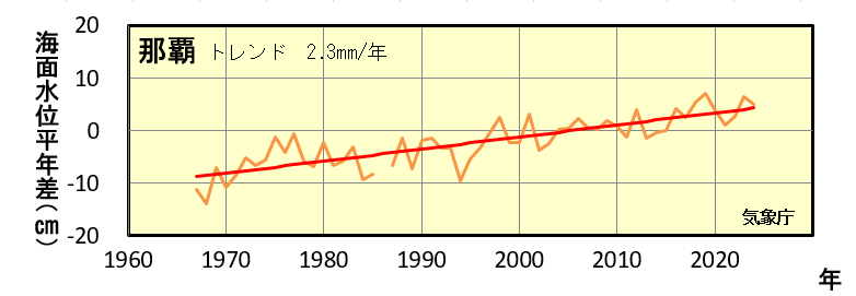 海面水位平年差(cm)は年平均潮位から平年値(1991~2020年平均)を引いたもの。橙の細線:年々の値、赤の直線:長期変化傾向(信頼水準90%以上で有意な長期変化傾向がある場合のみ表示)。使用地点:那覇(1967年~)、石垣(1969年~)。 なお、地盤変動は考慮していない