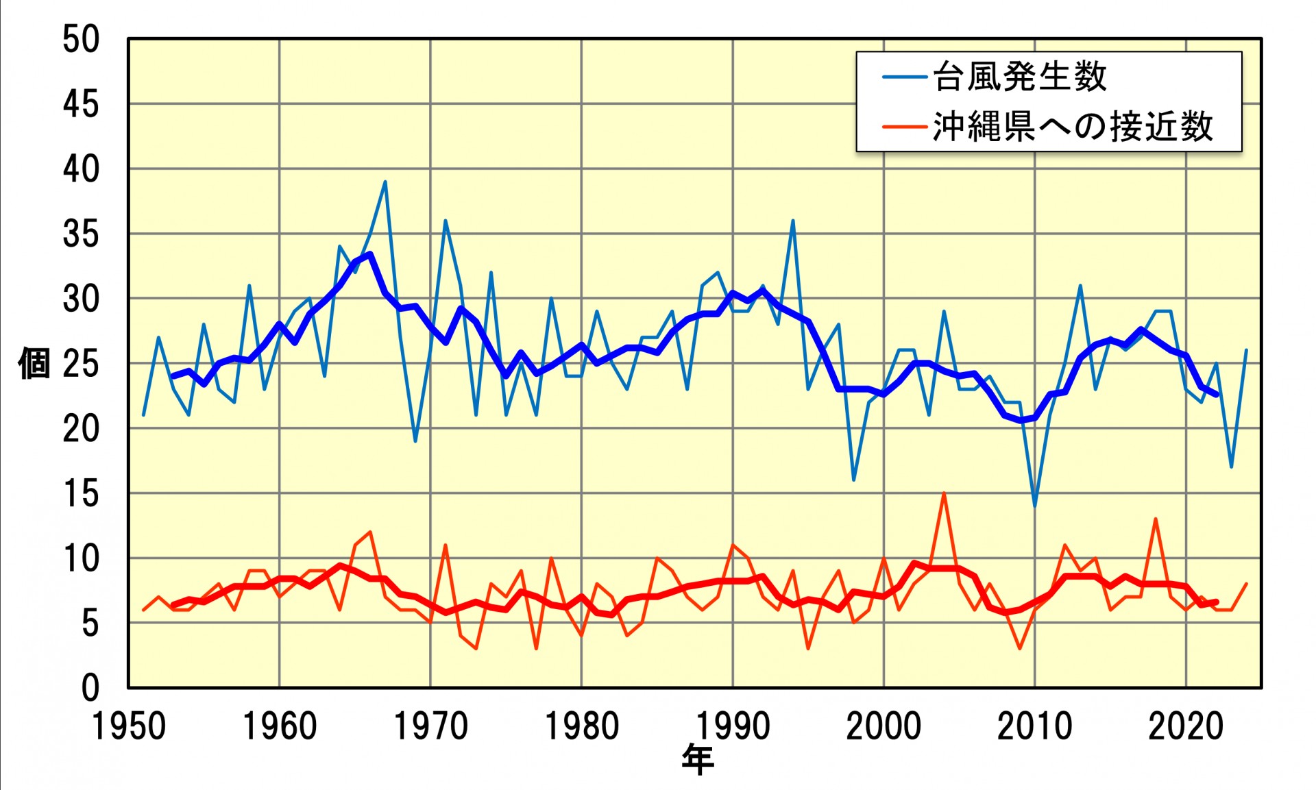 台風の発生数(青線)と沖縄地方への接近数(赤線)。いずれも細線が年々の値、太線が5年移動平均値。統計期間は1951~2022年。