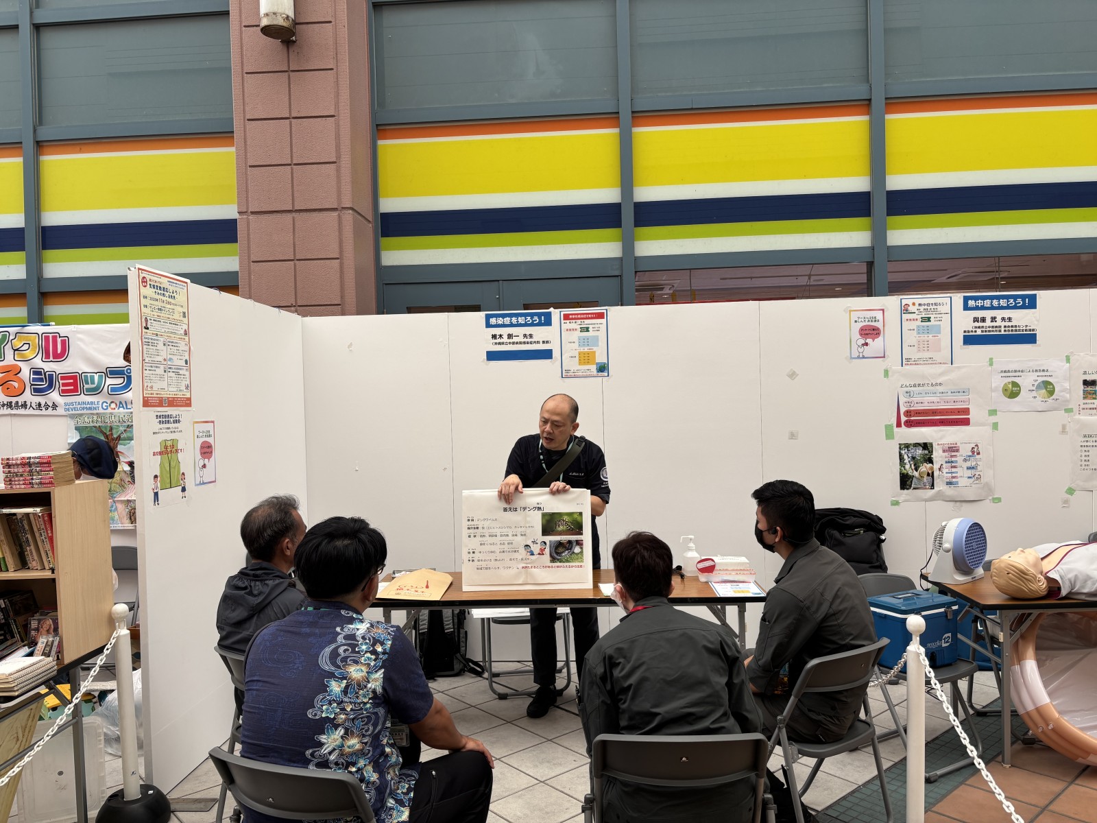 ブースでは、気候の変化で起こる感染症についてクイズで学んだり、熱中症の対応方法を看護師さんに教わりながら一緒に体験しています。