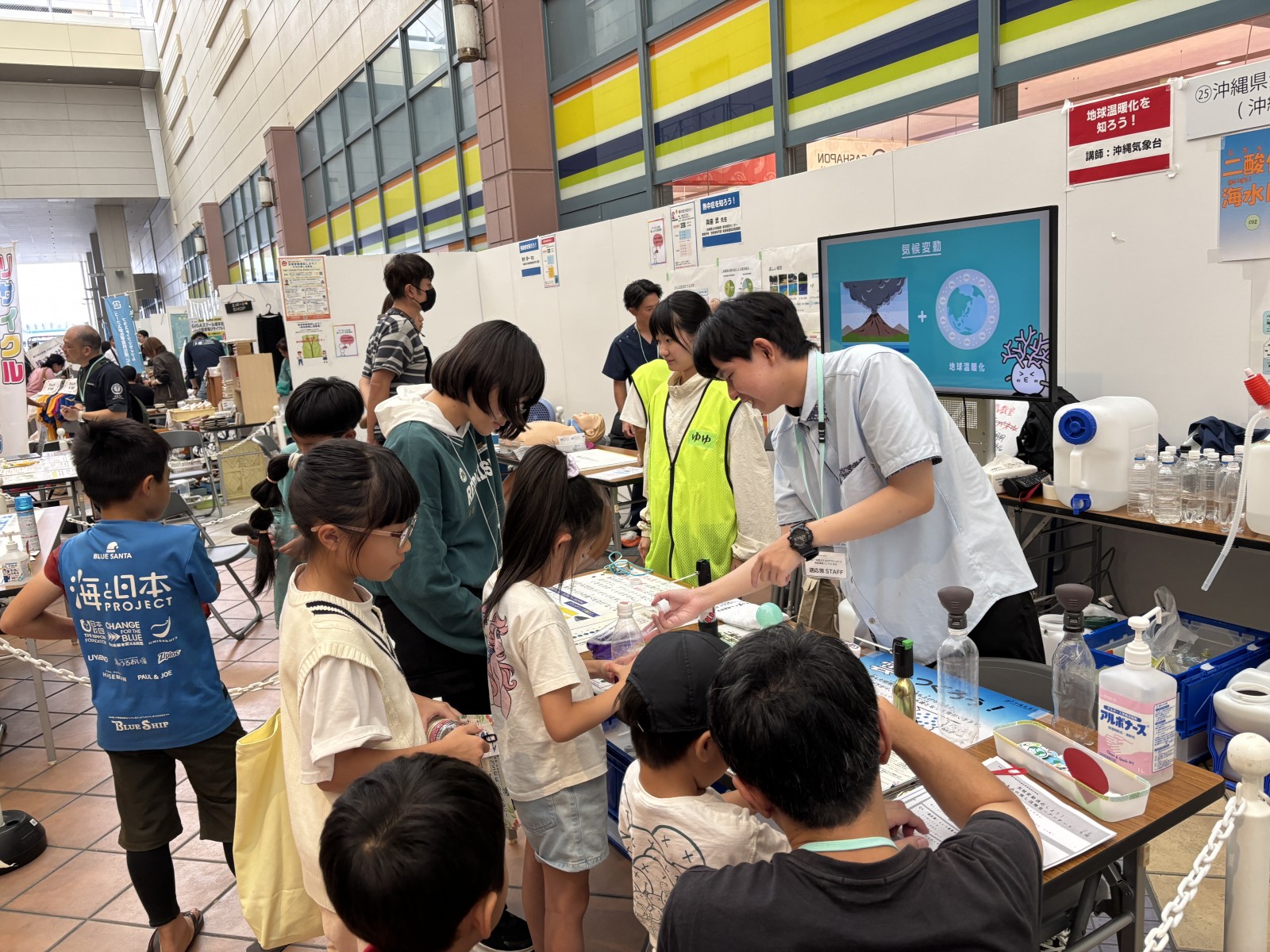 ステージでは、GODAC(国際海洋環境情報センター)の職員を講師に招き沖縄のサンゴと私たちの生活とのつながり親子でいっしょに考えています。
