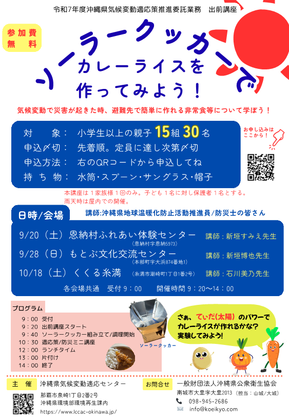 沖縄県気候変動適応センターは、令和7年9月20日から10月18日にかけて防災分野の適応策として「ソーラークッカーでカレーライスを作ってみよう!」と題して出前講座を開催しました。