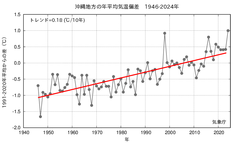 なお、詳しくは、沖縄気象台のHP(沖縄地方の気候変動 これまでの変化(観測事実))をご覧ください。(沖縄気象台のページへリンク)
