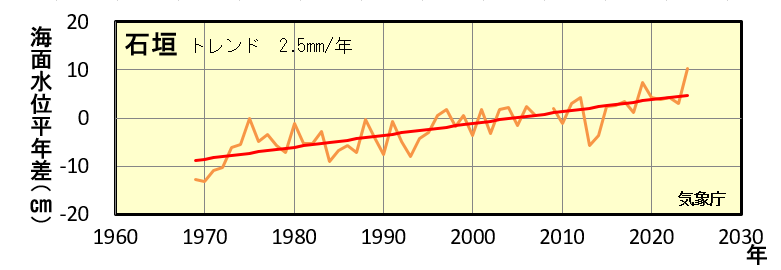 海面水位平年差(cm)は年平均潮位から平年値(1991~2020年平均)を引いたもの。橙の細線:年々の値、赤の直線:長期変化傾向(信頼水準90%以上で有意な長期変化傾向がある場合のみ表示)。使用地点:那覇(1967年~)、石垣(1969年~)。 なお、地盤変動は考慮していない