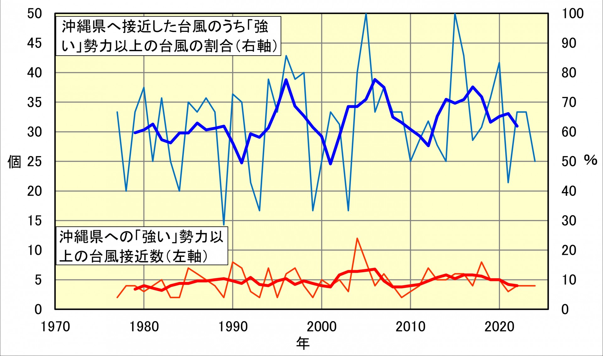 「強い」以上の勢力で沖縄地方に接近した台風の数(赤線)と、それが沖縄地方に接近した全台風に占める割合(%)(青線)。いずれも細線が年々の値、太線が5年移動平均値。統計期間は1977~2022年。