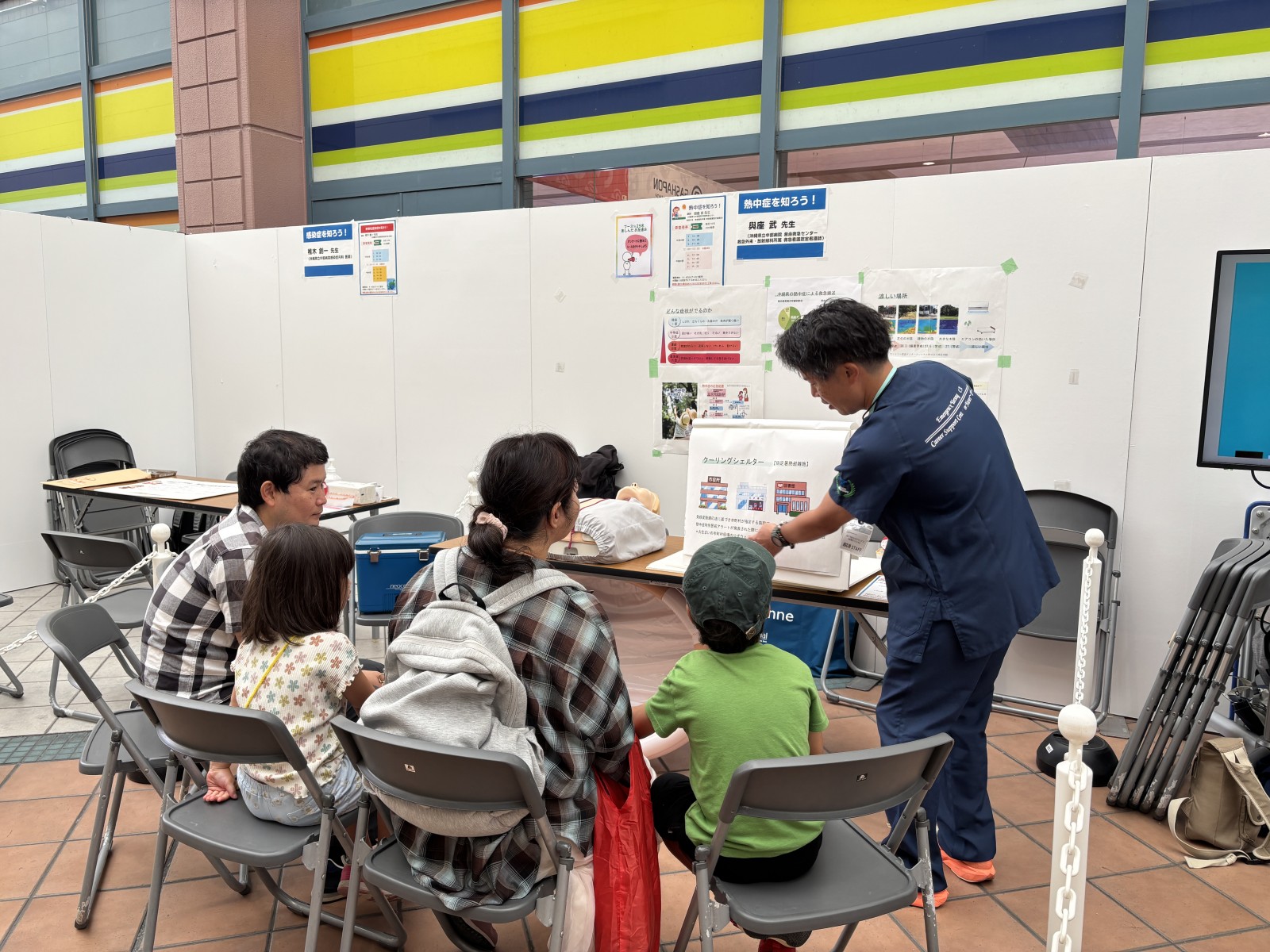 ブースでは、気候の変化で起こる感染症についてクイズで学んだり、熱中症の対応方法を看護師さんに教わりながら一緒に体験しています。