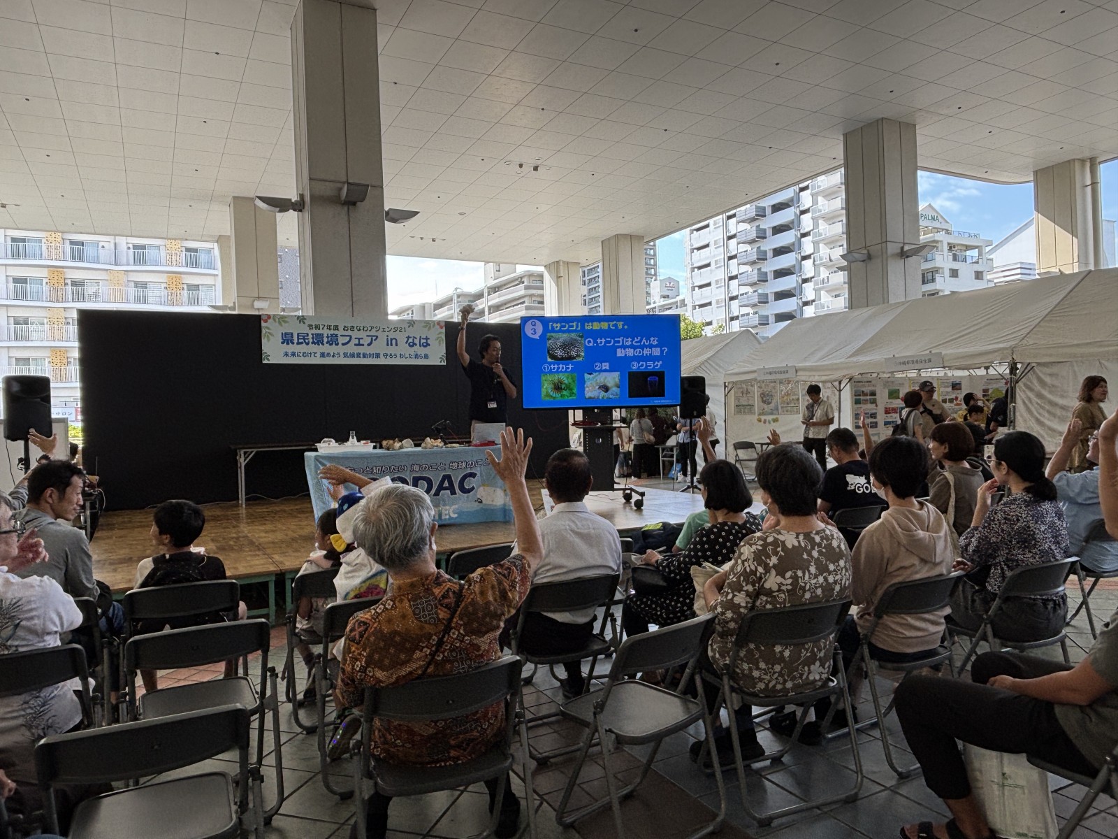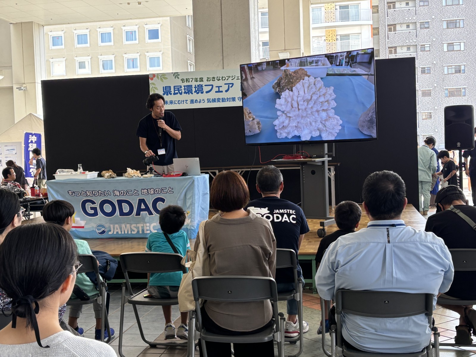 ステージでは、GODAC(国際海洋環境情報センター)の職員を講師に招き沖縄のサンゴと私たちの生活とのつながり親子でいっしょに考えています。