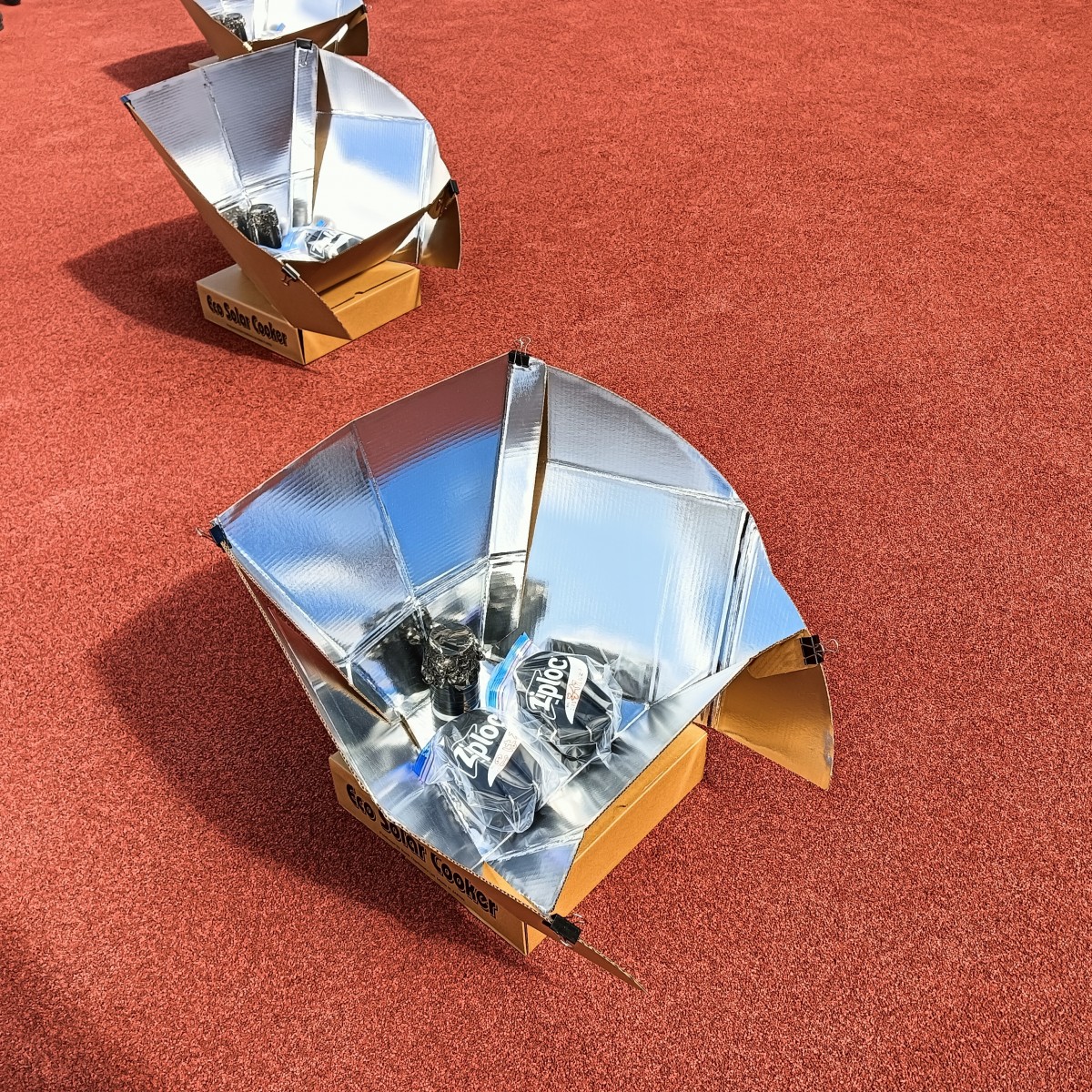 3回の出前講座に小学生と親子45組が参加し、お米の炊飯まで火を使わず太陽の力で作る体験をしました。曇り空ではなかなか難しい面もありましたが、親子で協力して太陽の当たる向きを調整するなど工夫して取り組んでいました。