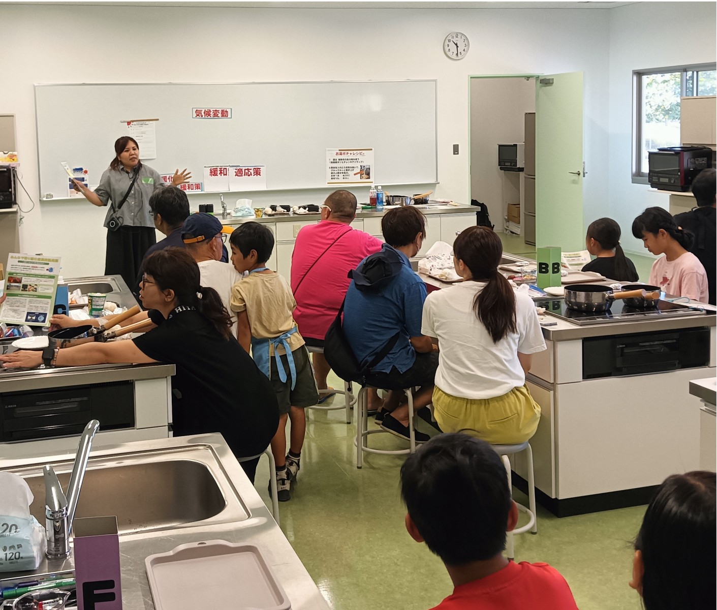 料理の合間にはセンターで作成した「適応カード」を使用して適応策や防災対策について親子で考える時間を設けています。