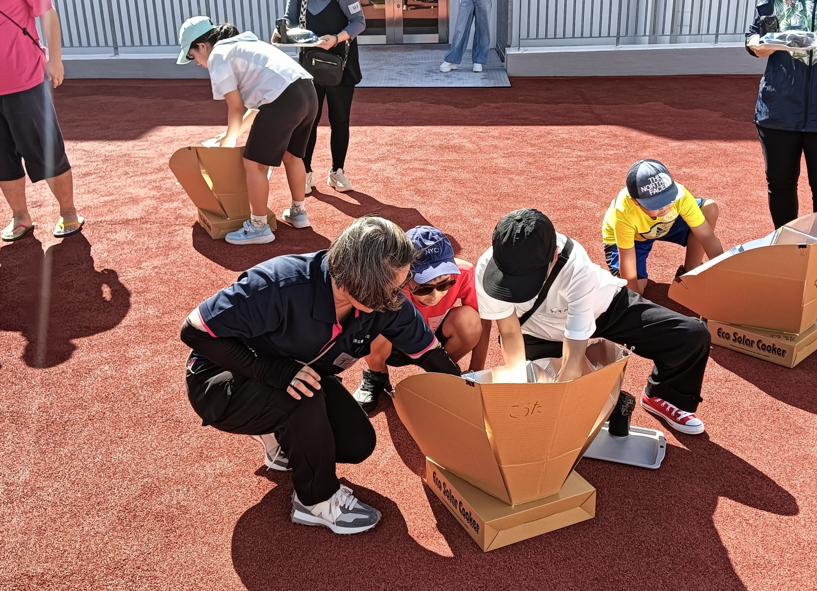 3回の出前講座に小学生と親子45組が参加し、お米の炊飯まで火を使わず太陽の力で作る体験をしました。曇り空ではなかなか難しい面もありましたが、親子で協力して太陽の当たる向きを調整するなど工夫して取り組んでいました。